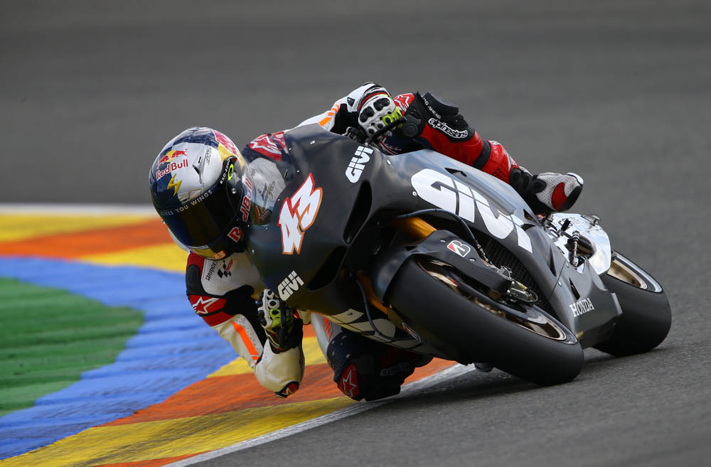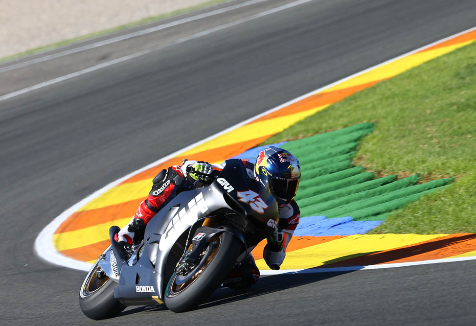 límite de la moto y faltaba todavía. En un par de ocasiones pude seguir a Márquez en algunas curvas y me di cuenta la cantidad de presión que pone en el neumático delantero en los virajes, lo que demuestra que estas gomas son capaces de aguantar casi lo que le eches. Mi objetivo es ir aprendiendo poco a poco. Hoy me he quedado a 0,3 segundos de Laverty y Baz que vienen del Mundial de SBK, por lo que están acostumbrados a pilotar motos de 1000cc y 160 kg. No podía dejar de sonreír pues pienso que hemos hecho un buen trabajo. No he tirado la moto al suelo, así que