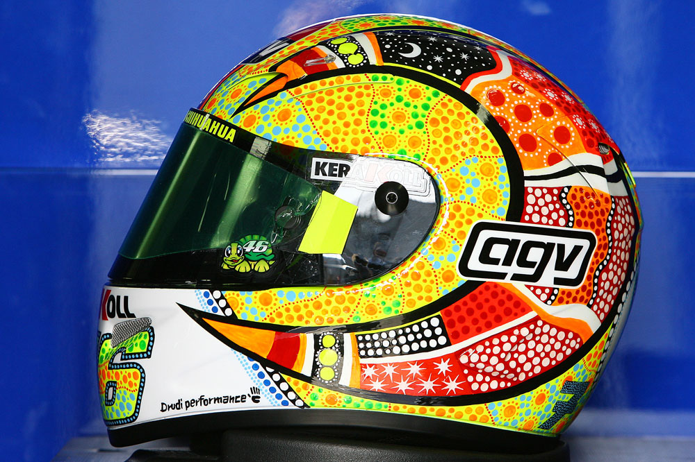 Valentino Rossi aprovechó la visita al trazado de Phillip Island en el año 2007 para cambiar su gráfica habitual por una que incluía motivos aborígenes. De esta forma, sus característicos símbolos del sol y luna, así como su número fetiche, el 46, fueron ‘australianizados’ gracias a este colorido diseño que homenajeaba al arte indígena del país. Como no podía ser de otra forma, fue ideado por su diseñador de cabecera Aldo Drudi.