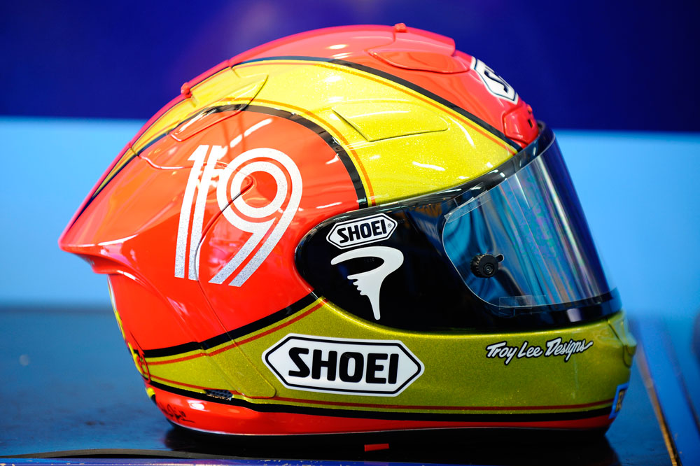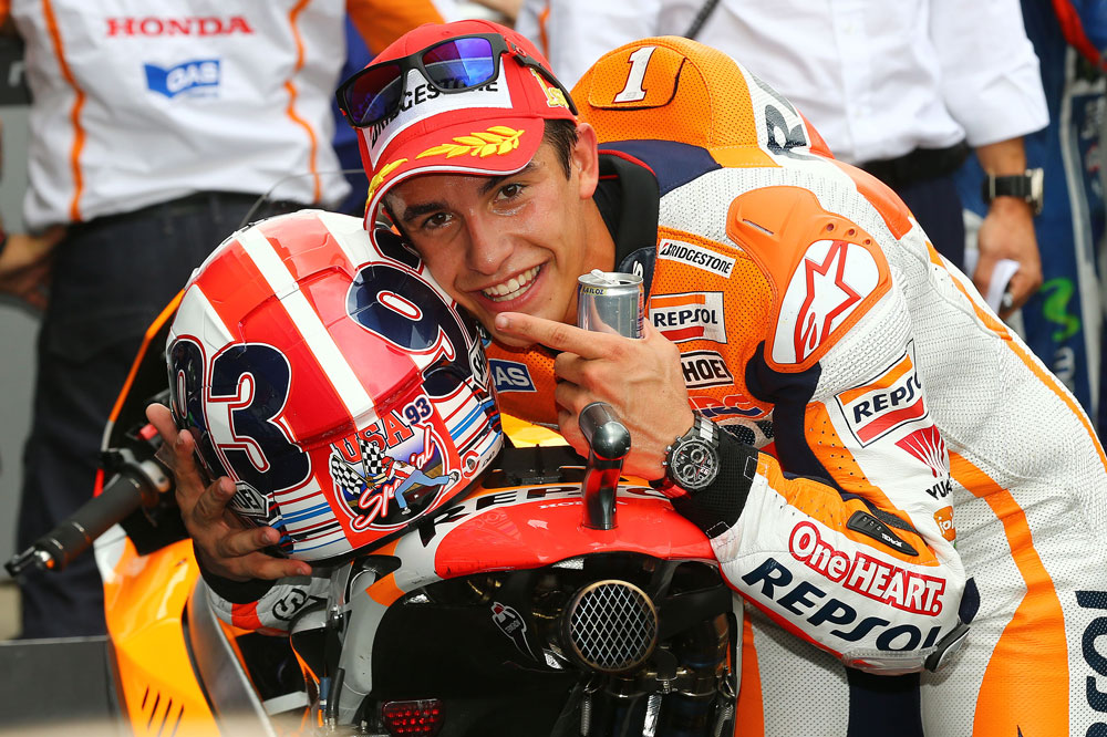 En sus escasos dos años en la categoría reina, a Marc Márquez ya le ha dado tiempo a exhibir diversos cascos singulares. Uno de los más llamativos fue el Shoei con el que participó en la cita de Motegi en 2013. Pintado en rojo y el blanco, colores de la bandera nipona, el integral incorporaba una caricatura del propio Marc estrechándose los ojos, emulando los rasgos faciales orientales. Sin embargo, lo que pretendía ser una broma bienintencionada fue tomada como una ofensa por algunos, por lo que el campeón se vio obligado a disculparse.