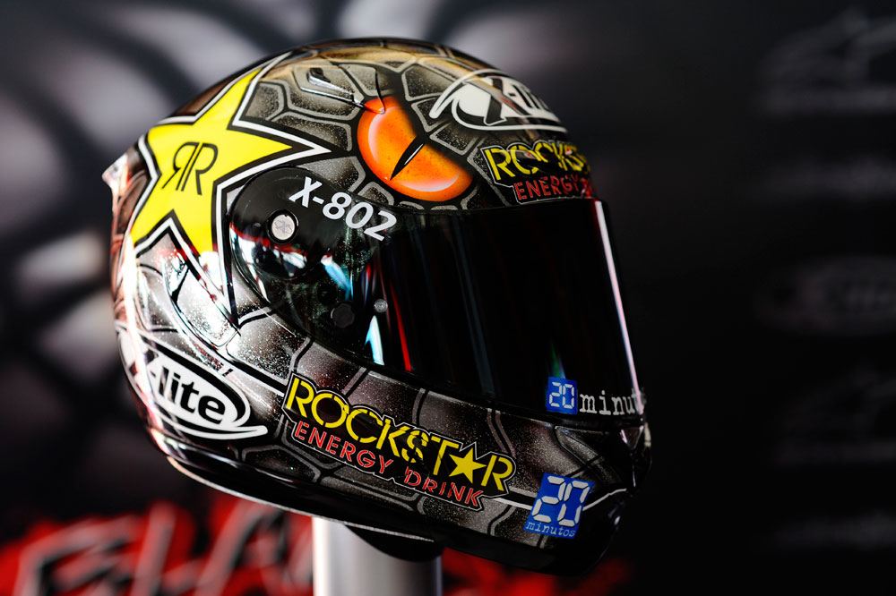 Si el anterior modelo lo catalogamos como uno de los más divertidos, este que nos ocupa ahora podría ser el más sentimental. Con él, Rossi quiso homenajear al malogrado Simoncelli, mezclando su gráfica habitual del sol y la luna con aquella que luciera su gran amigo. Un bonito detalle que vino a demostrar que Sic continuaba presente en el paddock.