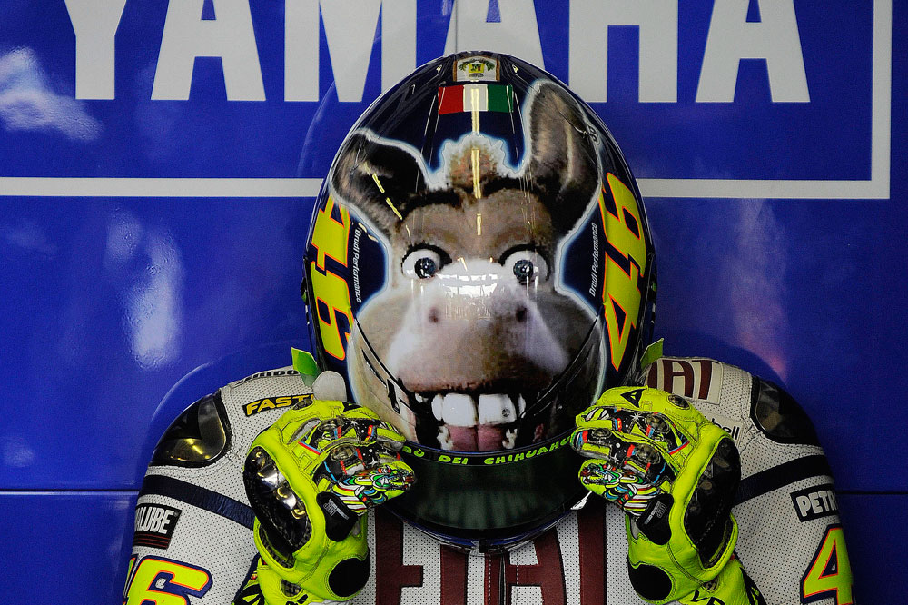 Valentino Rossi demostró que también sabe reírse de sí mismo con este casco que estrenó en el trazado de Misano. En él, el transalpino estampó la imagen del asno de la película Shrek en una clara referencia a sí mismo. Y es una carrera antes, en Indianápolis, el campeonísimo había cometido un error al no puntuar y permitir que su mayor rival, Lorenzo, le recortase 25 puntos.