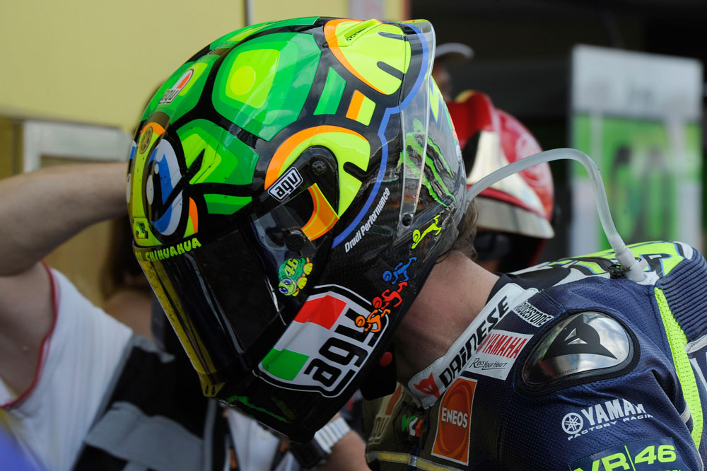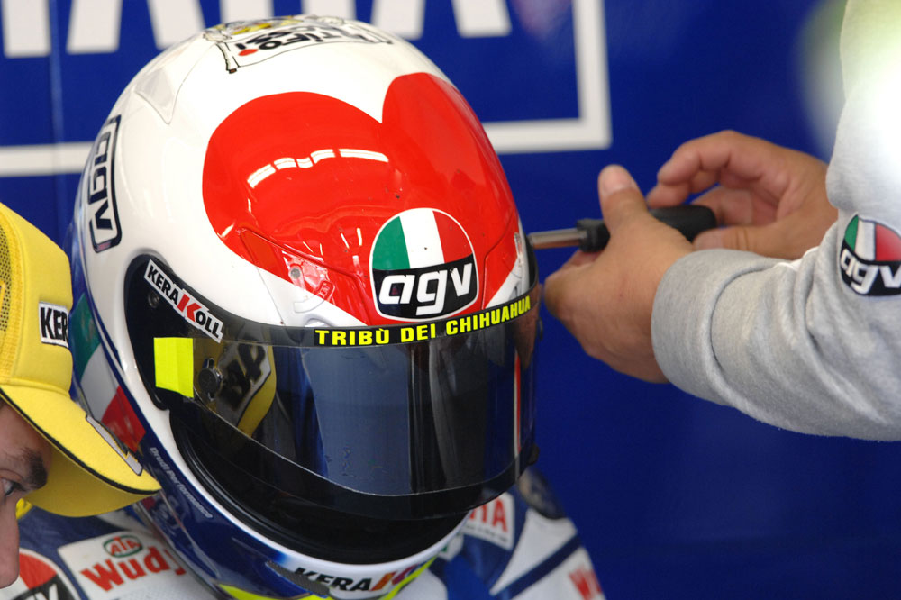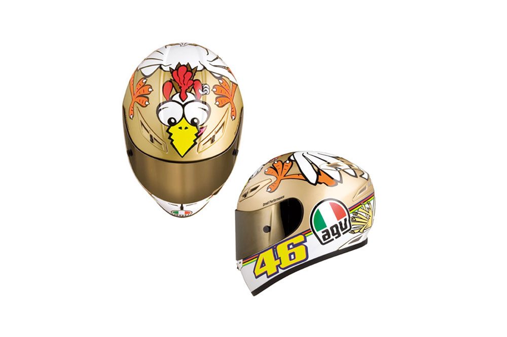 Valentino Rossi quiso celebrar su, hasta la fecha, último título mundial, poniéndose este AGV en el que se distinguía a una gallina empollando un huevo con el número 9. En la camiseta conmemorativa que vistió aquel día se podía leer “La gallina vieja hace buen caldo”, una frase que aludía directamente a su edad (30 años en aquel momento) y al hecho de que continuara siendo competitivo pese al empuje de los jóvenes talentos. Otra genialidad del Doctor.