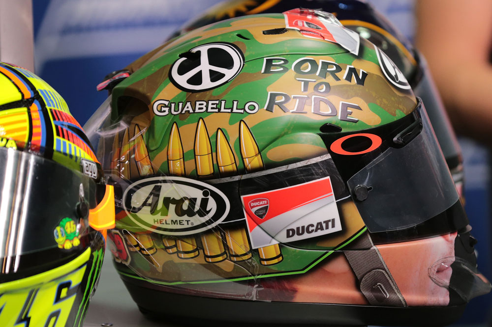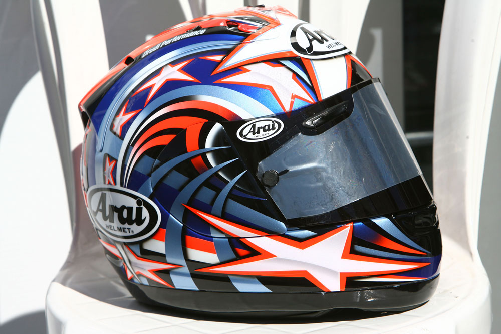De inspiración militar y con un lema que no dejaba lugar a dudas sobre las pretensiones del piloto (Born to ride). Así era el Arai que Nicky Hayden estrenó en el Gran Premio de Laguna Seca de 2013 y que volvió a usar unas semanas más tarde en Indianápolis. El diseño fue un éxito y lo prueba el hecho de que la marca lanzase poco después una edición limitada.