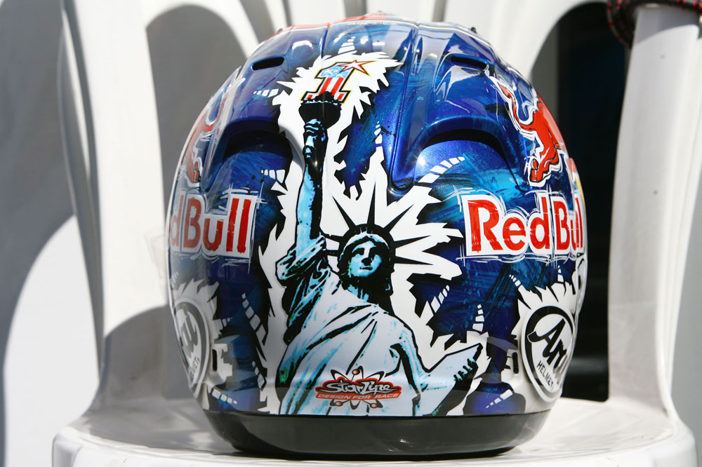 En ese mismo GP, otro piloto local, Nicky Hayden, también apeló a motivos nacionales para transformar su casco. En su caso, la estatua de la libertad y el Monte Rushmore sirvieron para escenificar la importancia de la carrera de casa.