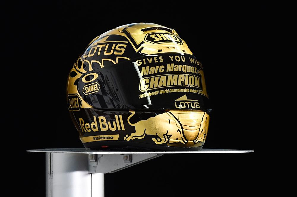 Continuamos el apartado ‘festivo’ con el Shoei que lució Marc Márquez este curso en Motegi, tras alzarse con su segundo mundial de la categoría reina. Decorado integrante en dorado y negro, incluye un gran número uno en la parte superior que dejan bien claro quien es, hoy por hoy, el rey de MotoGP.