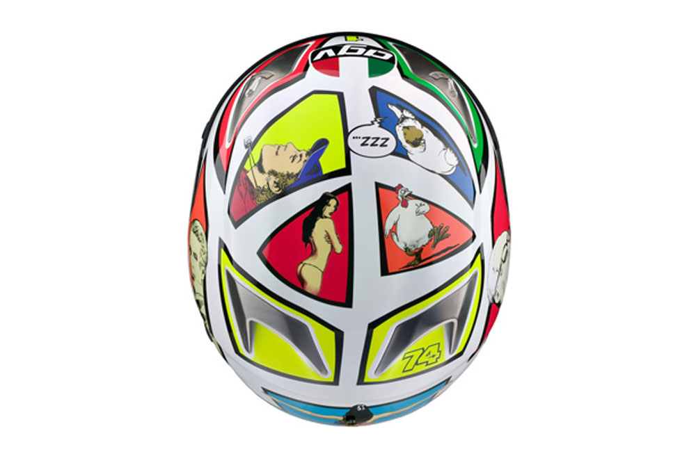 Previamente a la publicación de ‘Cuenta y seis’, Rossi empleó este casco en 2006 diseñado por Milo Manara que contaba con pequeñas escenas de cómic: el pollo Osvaldo, su perro Guido, despampanantes mujeres desnudas, Enzo Ferrari, el actor Steve McQueen y el propio Rossi conformaban el elenco de protagonistas de la historieta.