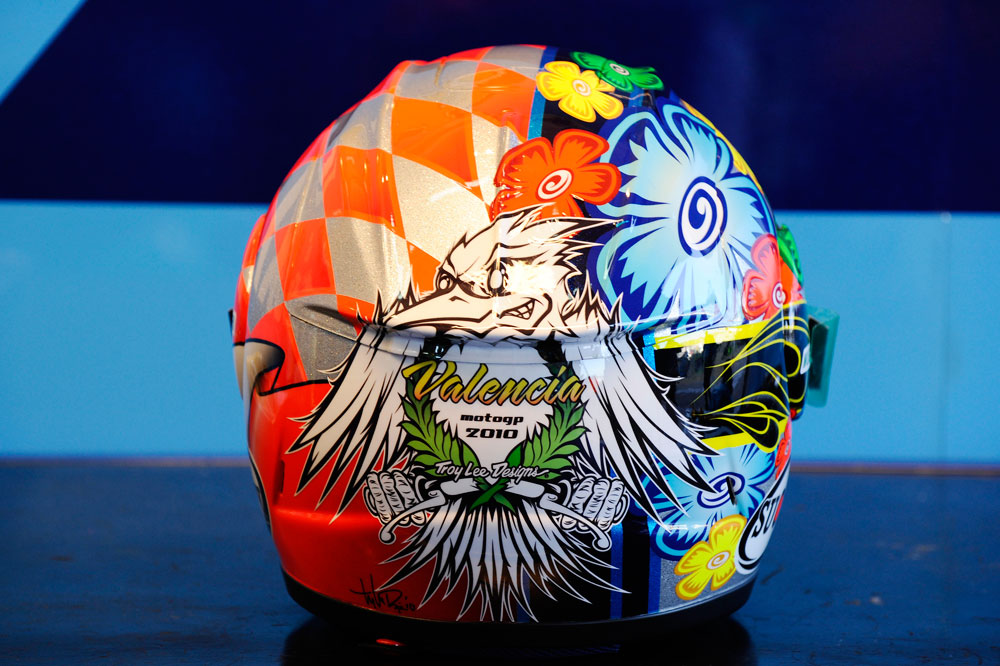 En la última prueba de la campaña 2010, el tándem del Rizla Suzuki, Álvaro Bautista y Loris Capirossi, exhibió un casco especial. El italiano se decantó por uno en el que destacaban los motivos florales.