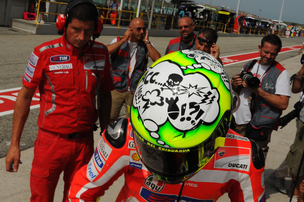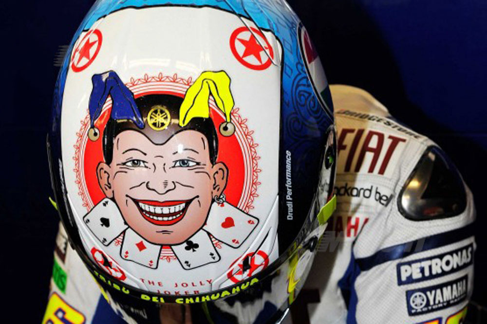 La falta de resultados en su primer año con Ducati fue el detonante principal del nacimiento de este diseño que lució Vale hace algo más de tres años. Los signos de interrogación y exclamación se intercalaban con dibujos de rayos, calaveras y bombas; todos sirvieron para mostrar con humor, una vez más, la difícil situación por la que atravesaba.