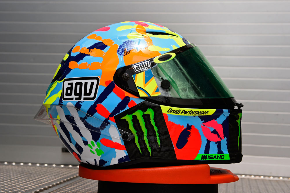 Las manos de su cuerpo de mecánicos, así como los labios de su novia y su madre adornaron el AGV de Rossi esta temporada en Misano. Un casco especial, para un Gran Premio especial en el que el italiano volvió a subir al escalón más alto del podio, cinco años después de su último triunfo en dicha pista.